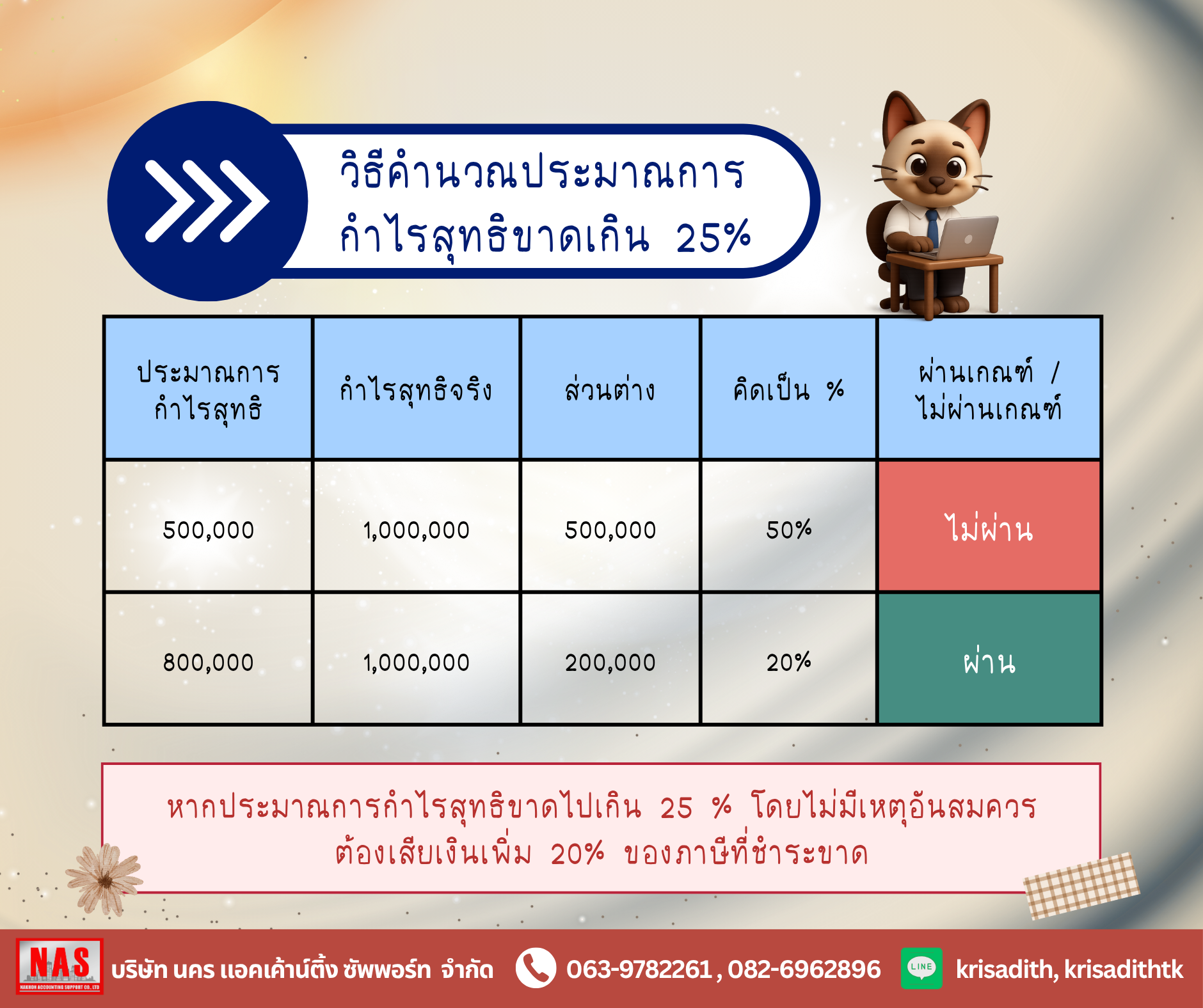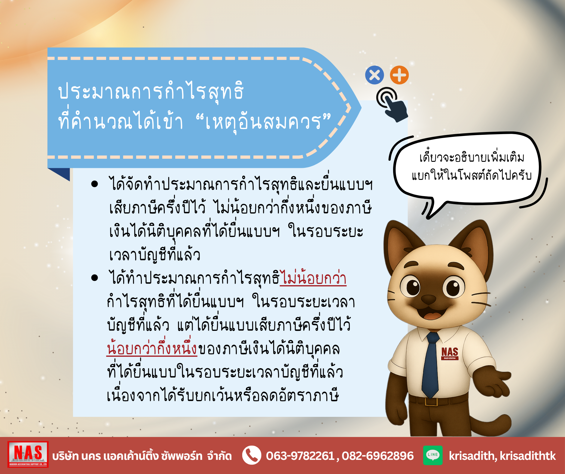 ในการยื่นภาษีครึ่งปีนั้น นักบัญชีหรือผู้ประกอบการจะต้องดำเนินการประมาณการกำไรสุทธืซึ่งได้จากกิจการ หากแสดงรายการประมาณการกำไรสุทธิขาดเกินร้อยละ 25 โดยไม่มีเหตุอันสมควร ต้องเสียเงินเพิ่มอีก 20% ของจำนวนเงินภาษีที่ต้องชำระตาม ม.67ทวิ (1) หรือของกึ่งหนึ่งของจำนวนเงินภาษีที่ต้องเสียในรอบระยะเวลาบัญชีนั้น หรือของภาษีที่ชำระขาด แล้วแต่กรณี