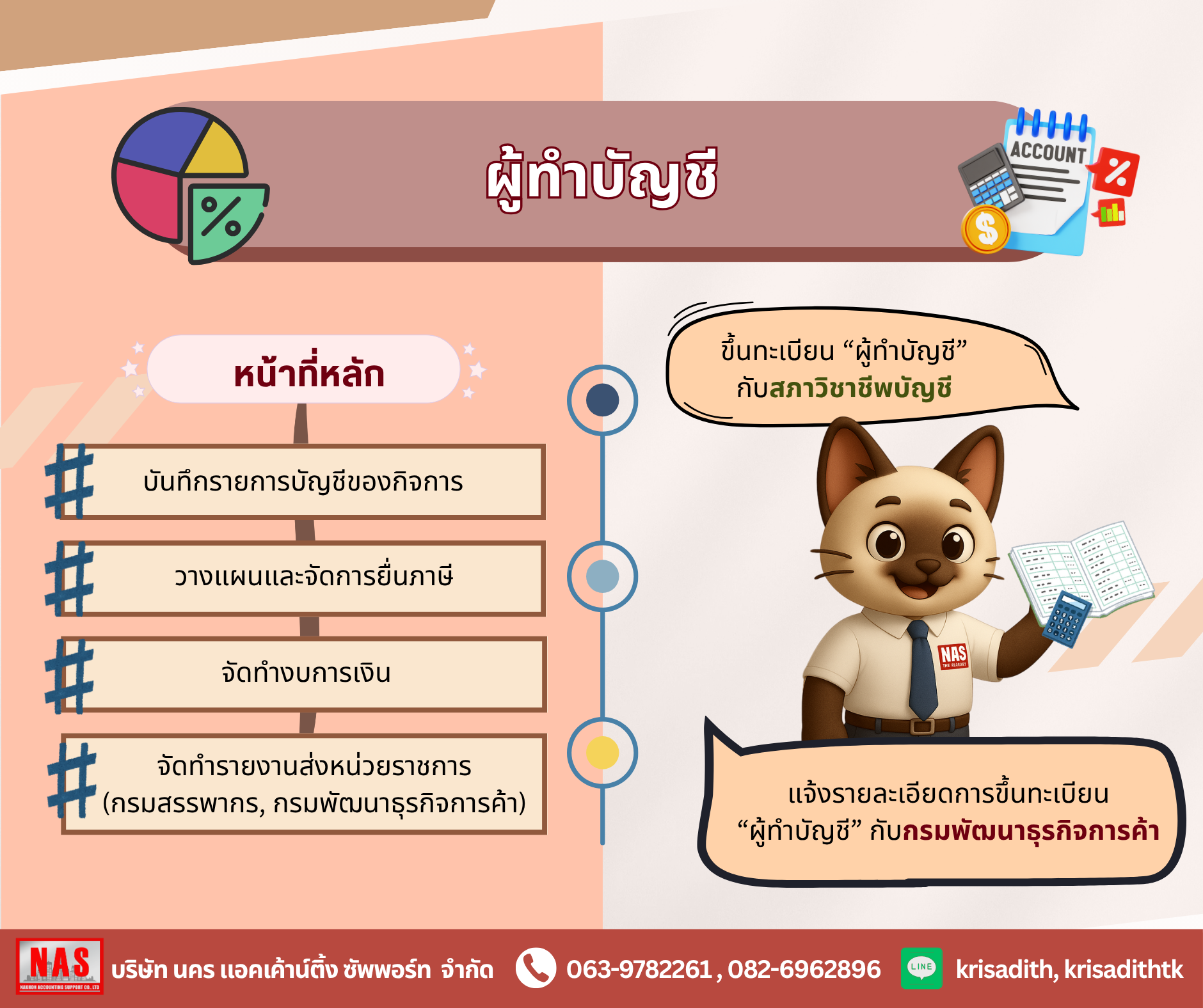 "ผู้ทำบัญชี" คือผู้ที่ให้คำแนะนำเกี่ยวกับเรื่องการเงินและการวางแผนยื่นภาษี มีหน้าที่ในการรวบรวม จัดทำบัญชี และตรวจสอบข้อมูลทางการเงินของบุคคลหรือองค์กร เพื่อช่วยให้ธุรกิจดำเนินงานได้อย่างมีประสิทธิภาพ