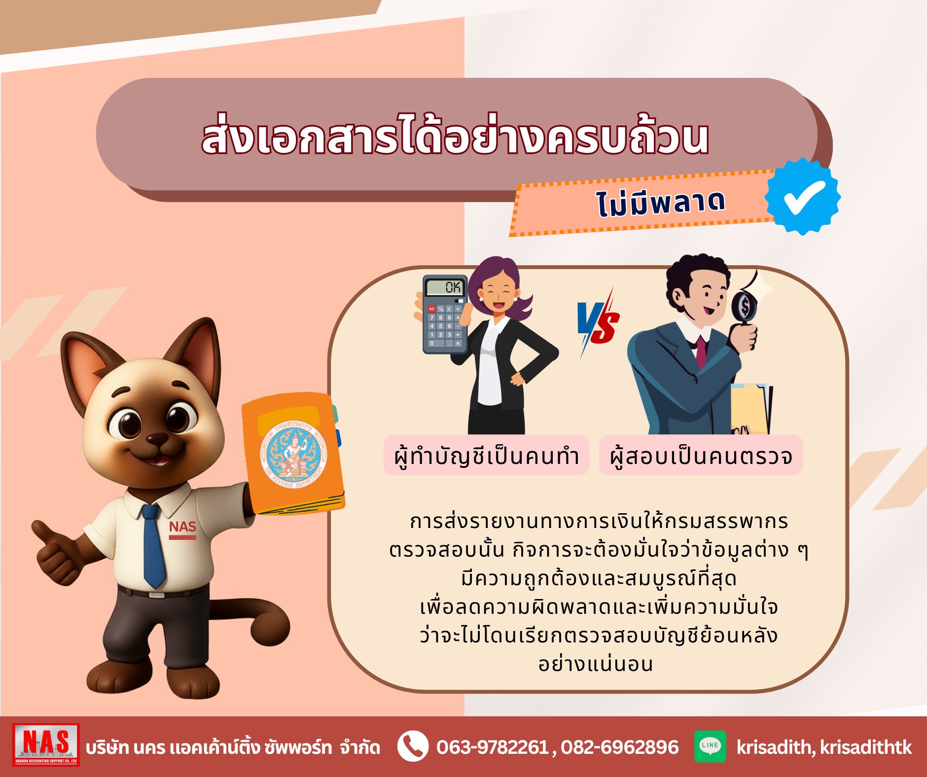 การส่งรายงานทางการเงินให้กรมสรรพากรนั้น กิจการต้องมั่นใจว่าข้อมูลต่าง ๆ ได้ทำการตรวจสอบว่าถูกต้องสมบูรณ์ที่สุด โดยผู้สอบบัญชีจะเป็นคนเก็บรายละเอียดข้อมูลต่าง ๆ มาพิจารณาว่าผ่านกฎเกณฑ์หรือไม่ หากผ่านก็จะทำการเซ็นรับรองว่าข้อมูลต่าง ๆ นั้นถูกรับรองเป็นที่เรียบร้อย แต่ถ้าไม่ผ่านก็จะส่งรายงานเอกสารกลับมาให้แก้ไข ก่อนที่จะส่งเรื่องไปยังกรมสรรพากร เพิ่มความมั่นใจว่าจะไม่มีปัญหาการโดนตรวจสอบบัญชีย้อนหลังอย่างแน่นอน
