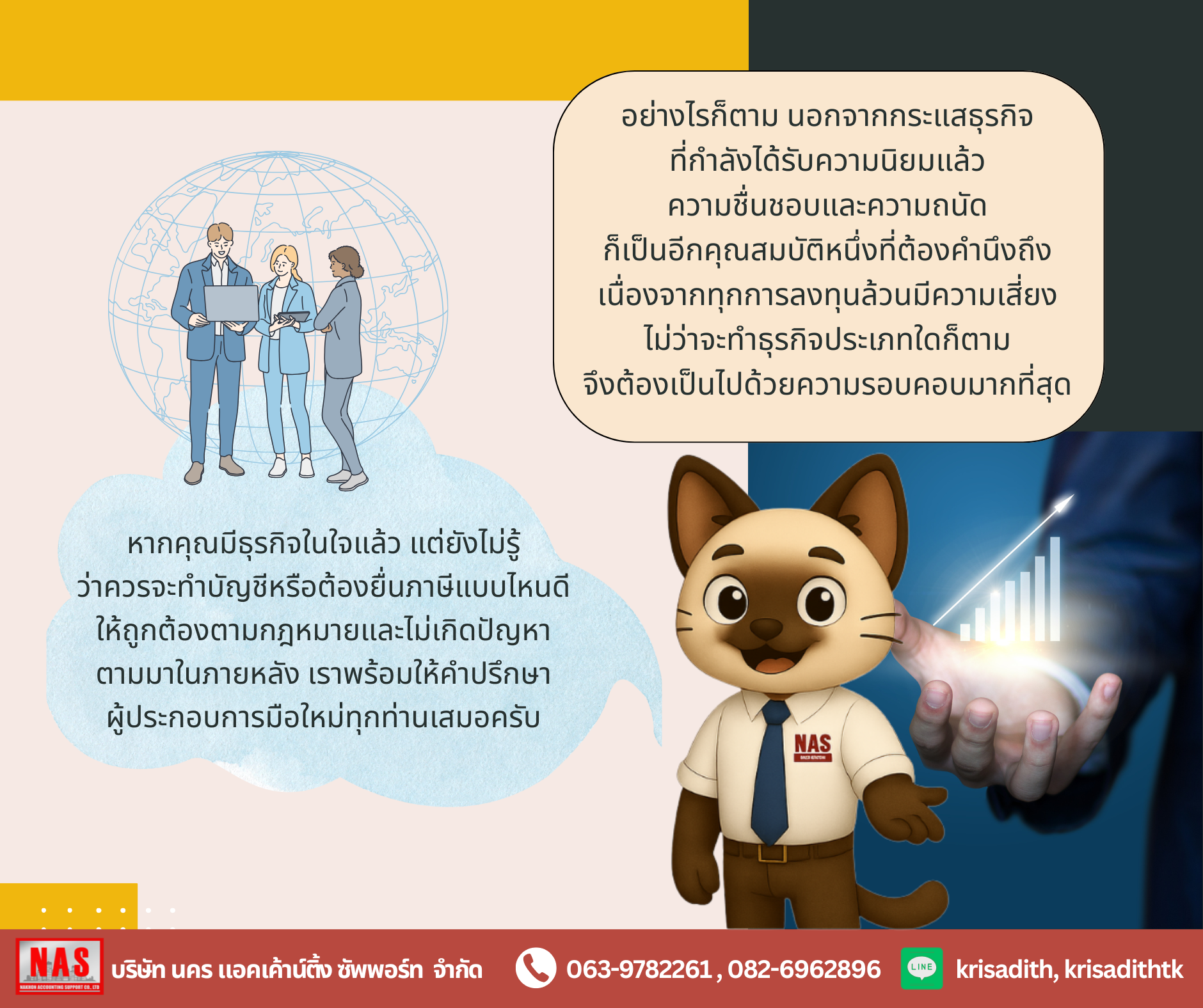 อย่างไรก็ตาม นอกจากกระแสธุรกิจที่กำลังได้รับความนิยมแล้ว ความชื่นชอบและความถนัดก็เป็นอีกคุณสมบัติหนึ่งที่ต้องคำนึงถึง เนื่องจากทุกการลงทุนล้วนมีความเสี่ยงไม่ว่าจะทำธุรกิจประเภทใดก็ตาม จึงต้องเป็นไปด้วยความรอบคอบมากที่สุด