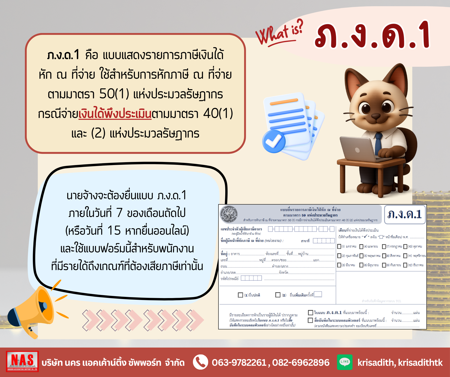 ภ.ง.ด. 1 คือ แบบแสดงรายการภาษีเงินได้หัก ณ ที่จ่ายสำหรับแต่ละเดือน ซึ่งนายจ้างมีหน้าที่ยื่นต่อกรมสรรพากรตามมาตรา 50 (1) เมื่อมีเงินได้พึงประเมินตาม 40 (1) - (2) ในอัตราร้อยละที่กำหนดไว้ หรือก็คือเอกสารที่แสดงว่านายจ้างมีการเก็บภาษีหัก ณ ที่จ่ายเป็นจำนวนเงินทั้งหมดเท่าไหร่ โดย ภ.ง.ด.1 จะใช้สำหรับแจ้งพนักงานที่มีรายได้ถึงฐานที่ต้องเสียภาษีแล้วเท่านั้น หากพนักงานมีเงินได้ไม่ถึงฐานที่ต้องเสียภาษี นายจ้างก็ไม่ต้องยื่น ภ.ง.ด. 1