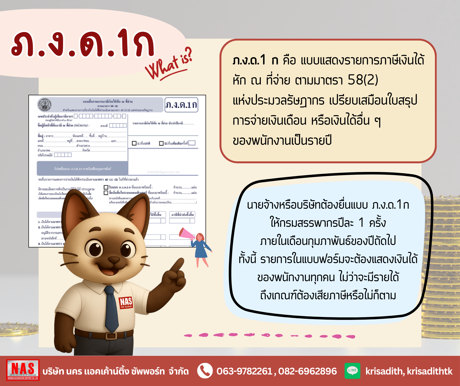 ภ.ง.ด. 1ก คือ แบบแสดงรายการภาษีเงินได้หัก ณ ที่จ่าย ตามมาตรา 58(2) แห่งประมวลรัษฎากร เปรียบเสมือนใบสรุปการจ่ายเงินเดือน หรือเงินได้อื่น ๆ ของพนักงานแบบรายปี