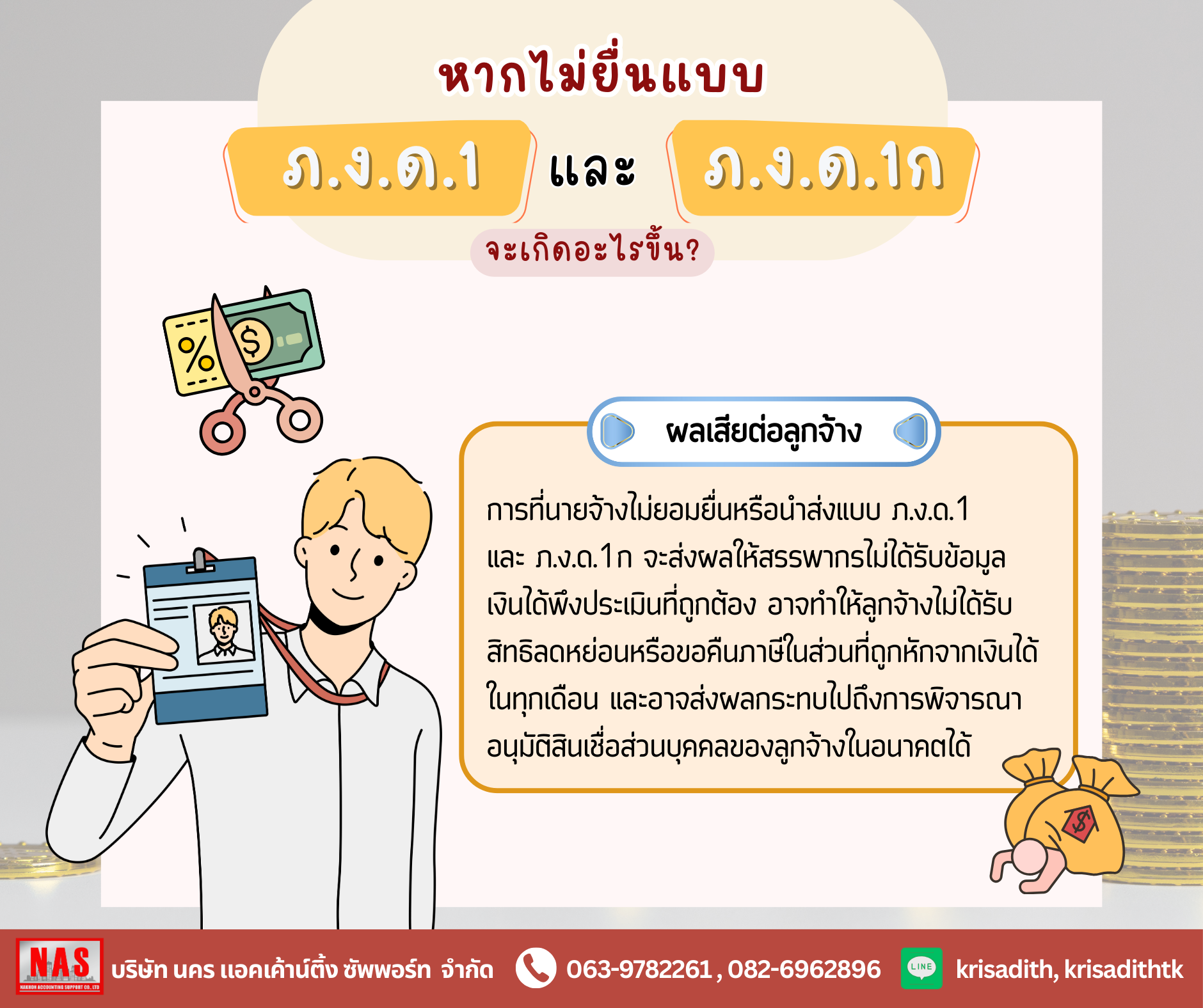 สำหรับลูกจ้างนั้น การที่นายจ้างไม่ยอมยื่นหรือนำส่งแบบ ภ.ง.ด. 1 และ ภ.ง.ด. 1ก จะส่งผลให้สรรพากรไม่ได้รับข้อมูลเงินได้พึงประเมินที่ถูกต้อง ซึ่งอาจทำให้ลูกจ้างไม่ได้รับสิทธิลดหย่อนหรือขอคืนภาษีในส่วนที่ถูกหักจากเงินได้ในทุกเดือน และอาจส่งผลกระทบไปถึงการพิจารณาอนุมัติสินเชื่อส่วนบุคคลของลูกจ้างในอนาคตได้