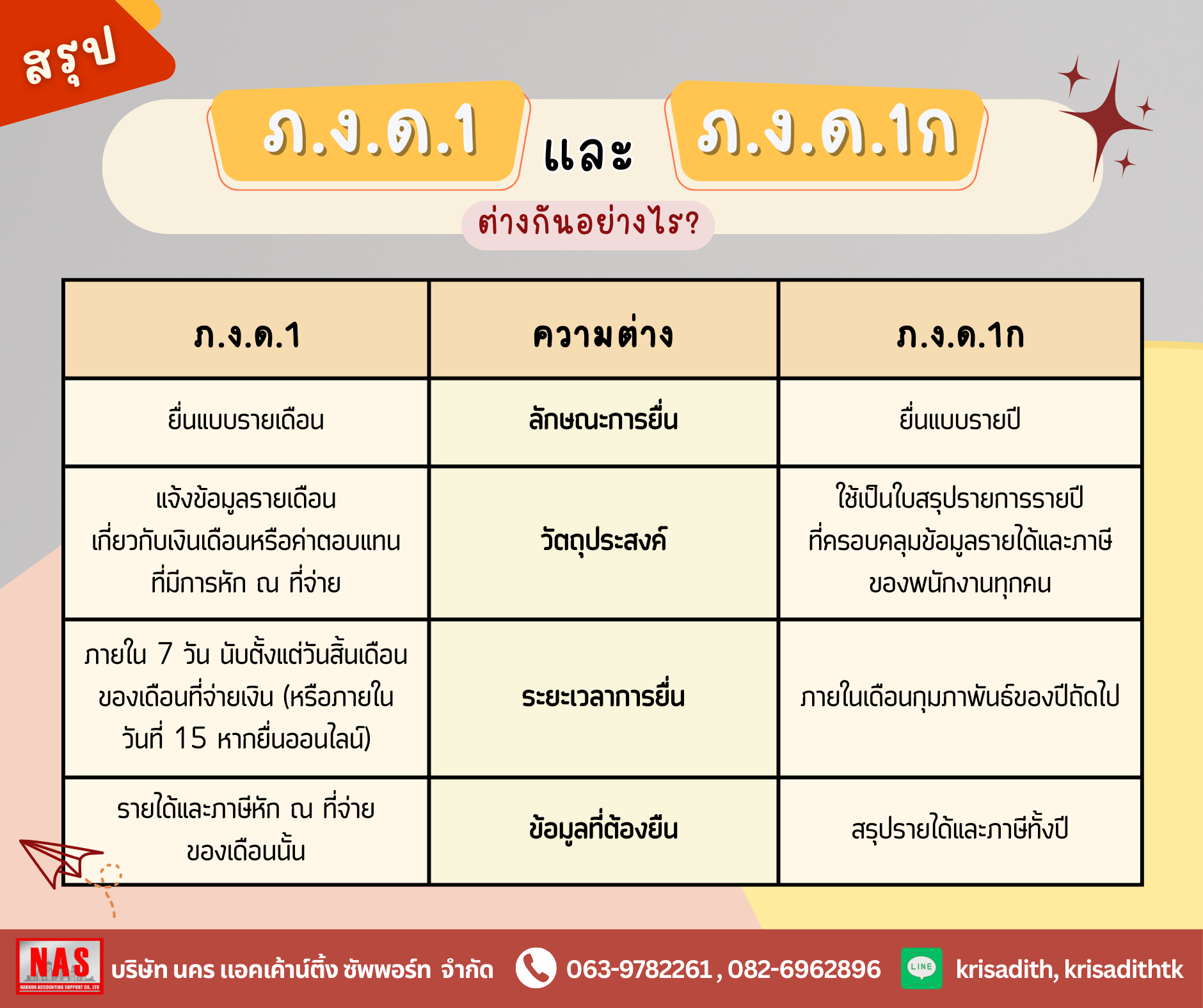 โดยสรุปแล้วแบบ ภ.ง.ด. 1 และ ภ.ง.ด. 1ก จะมีความแตกต่างกันดังนี้