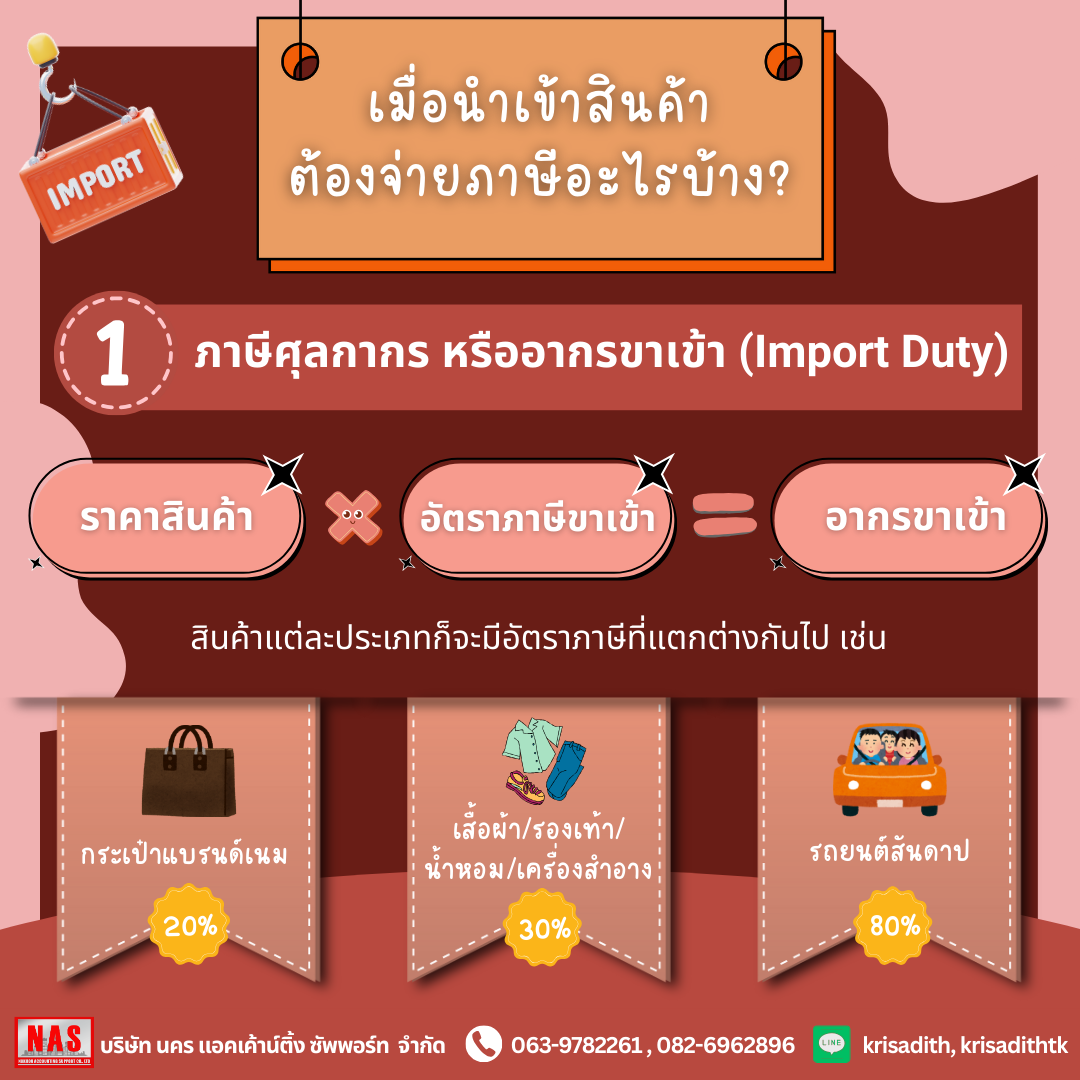 ภาษีที่ต้องชำระเป็นอย่างแรกเมื่อนำสินค้าเข้าไทยก็คือ “อากรขาเข้า” เป็นภาษีที่ทางกรมศุลกากรเรียกเก็บจากสินค้าที่นำเข้ามาในประเทศไทย โดยการคำนวณสินค้าจะใช้มูลค่าสินค้าทั้งหมด รวมค่าประกัน และค่าขนส่ง หรือ CIF (Cost, Insource, Freight) โดยจะนำมาคูณกับอัตราภาษีตามประเภทของสินค้า ซึ่งสินค้าแต่ละประเภทก็จะมีอัตราภาษีที่แตกต่างกันไป อาทิเช่น