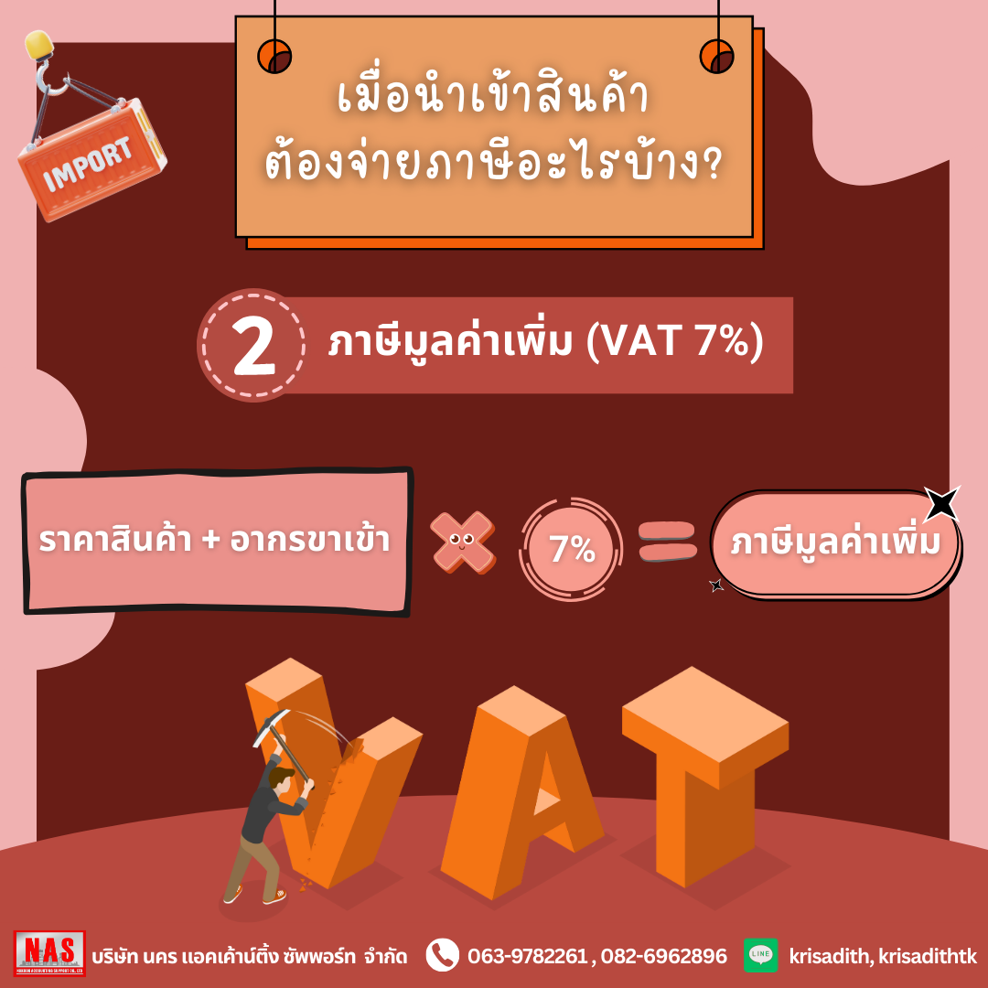 (ราคาสินค้า + อากรขาเข้า) x 7% = ภาษีมูลค่าเพิ่ม