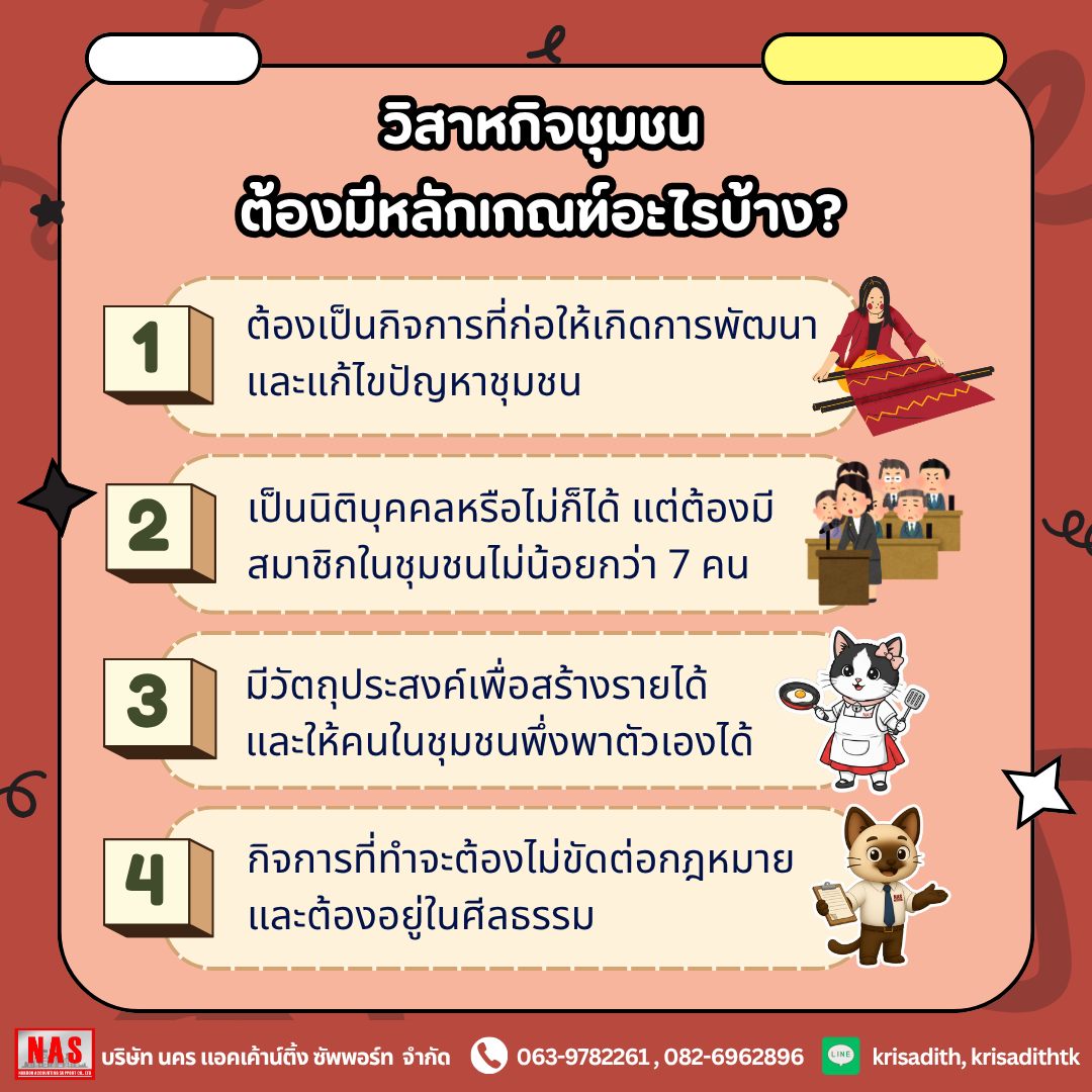 ต้องเป็นกิจการที่เกี่ยวกับการผลิตสินค้า ให้บริการ หรือกิจการอื่นๆ ที่ทำให้พัฒนาและแก้ไขปัญหาของชุมชน