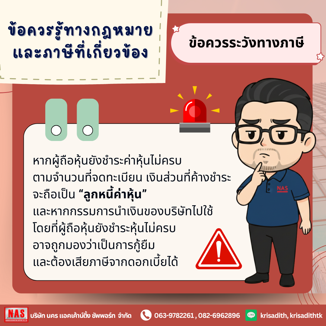 หากผู้ถือหุ้นยังชำระค่าหุ้นไม่ครบตามจำนวนที่จดทะเบียน เงินส่วนที่ค้างชำระจะถือเป็น “ลูกหนี้ค่าหุ้น” และหากกรรมการนำเงินของบริษัทไปใช้โดยที่ผู้ถือหุ้นยังชำระค่าหุ้นไม่ครบ อาจถูกมองว่าเป็นการกู้ยืมและต้องเสียภาษีจากดอกเบี้ยได้