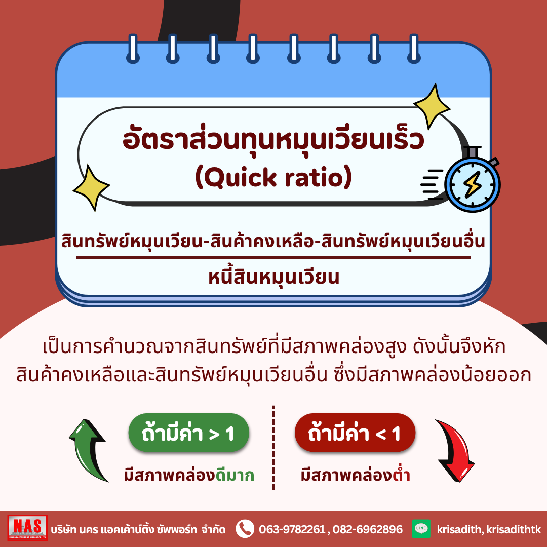 2. อัตราส่วนทุนหมุนเวียนเร็ว (Quick ratio) = (สินทรัพย์หมุนเวียน – สินค้าคงเหลือ – สินทรัพย์หมุนเวียนอื่น) / หนี้สินหมุนเวียน