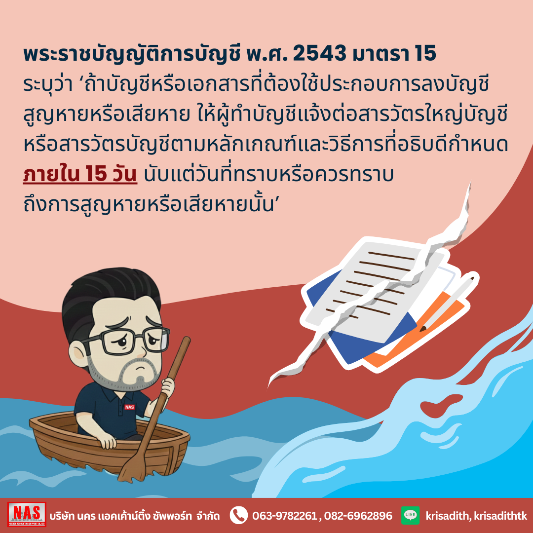 หากพบว่าเอกสารทางบัญชีของคุณมีความเสียหาย หรือสูญหายจากเหตุภัยพิบัติ ตามพระราชบัญญัติการบัญชี พ.ศ. 2543 มาตรา 15 ระบุไว้ว่า ‘ถ้าบัญชีหรือเอกสารที่ต้องใช้ประกอบการลงบัญชีสูญหายหรือเสียหาย ให้ผู้มีหน้าที่จัดทำบัญชีแจ้งต่อสารวัตรใหญ่บัญชีหรือสารวัตรบัญชีตามหลักเกณฑ์และวิธีการที่อธิบดีกำหนดภายในสิบห้าวันนับแต่วันที่ทราบหรือควรทราบถึงการสูญหายหรือเสียหายนั้น’