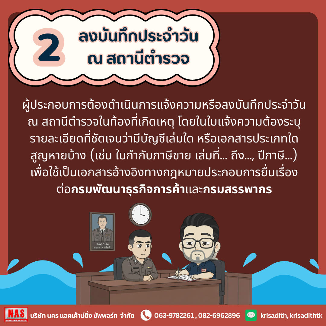 ผู้ประกอบการต้องดำเนินการแจ้งความหรือลงบันทึกประจำวัน ณ สถานีตำรวจในท้องที่เกิดเหตุ โดยในใบแจ้งความต้องระบุรายละเอียดที่ชัดเจนว่ามีบัญชีเล่มใด หรือเอกสารประเภทใดสูญหายบ้าง (อาทิ ใบกำกับภาษีขาย เล่มที่... ถึง..., ปีภาษี...) เพื่อใช้เป็นเอกสารอ้างอิงทางกฎหมายประกอบการยื่นเรื่องต่อกรมพัฒนาธุรกิจการค้าและกรมสรรพากร