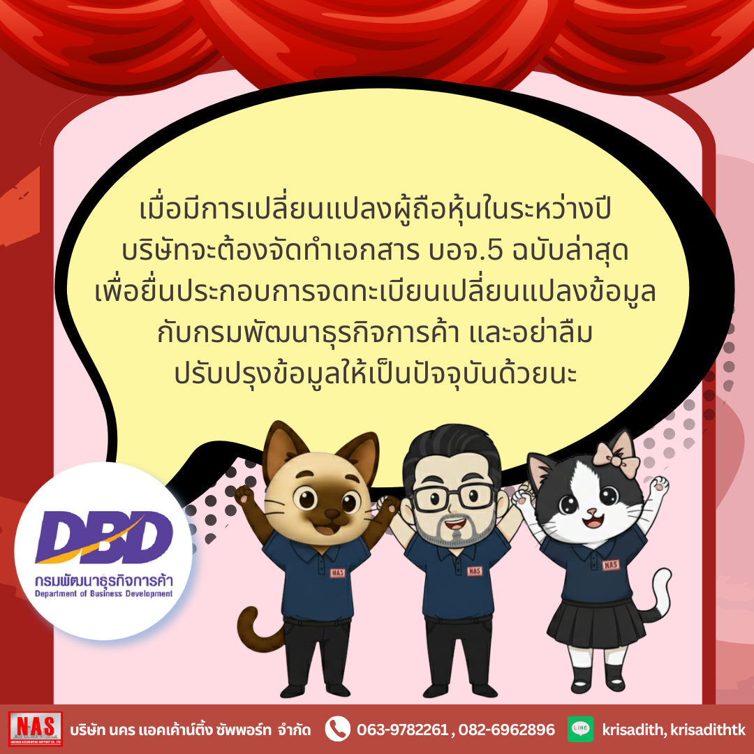 เมื่อมีการเปลี่ยนแปลงผู้ถือหุ้นในระหว่างปี บริษัทจะต้องจัดทำเอกสาร บอจ.5 ฉบับล่าสุด เพื่อยื่นประกอบการจดทะเบียนเปลี่ยนแปลงข้อมูลกับกรมพัฒนาธุรกิจการค้า และอย่าลืมปรับปรุงข้อมูลให้เป็นปัจจุบันด้วยนะ