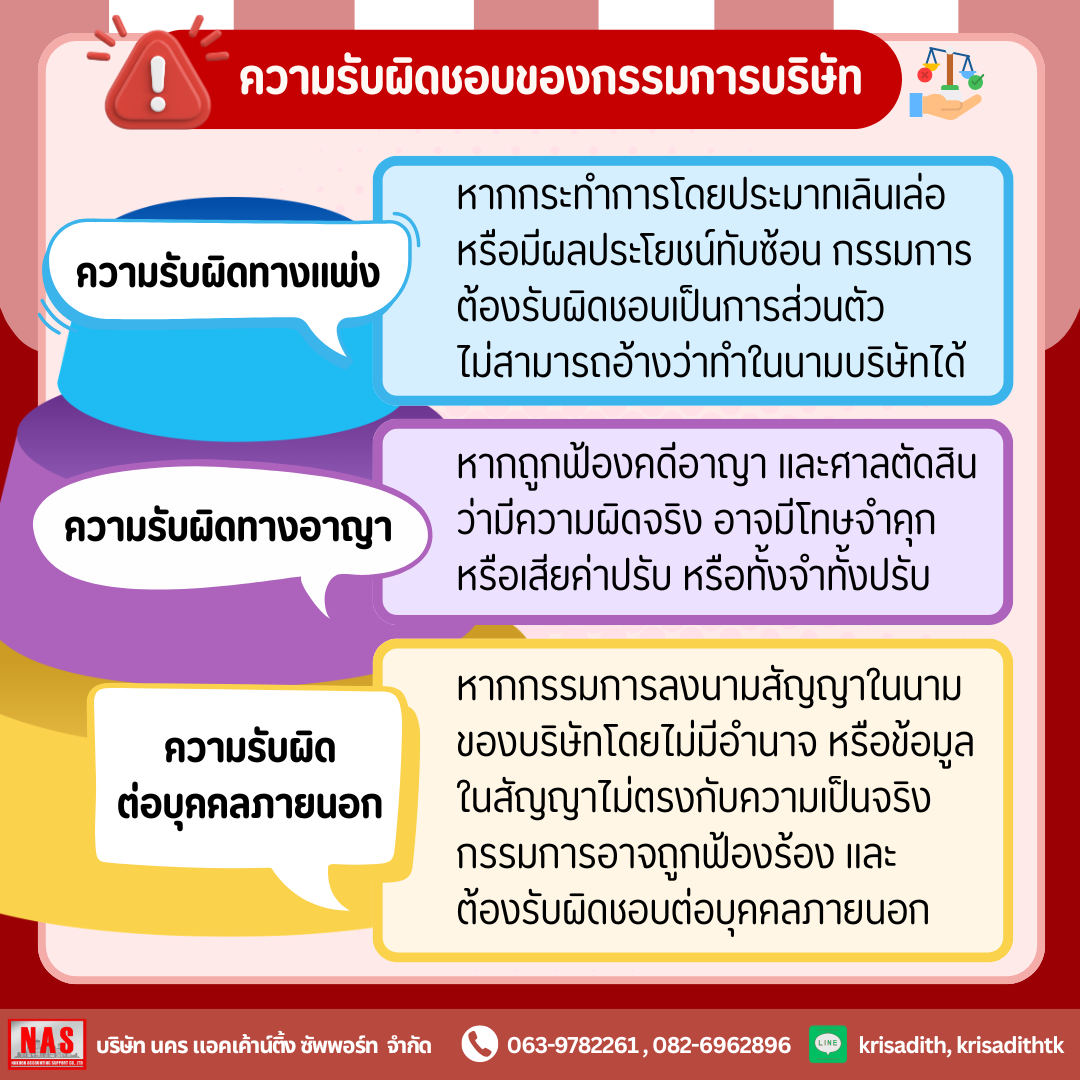 กรรมการบริษัทต้องรับผิดชอบต่อการละเมิดกฎหมายในหลายกรณี เช่น
