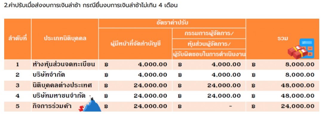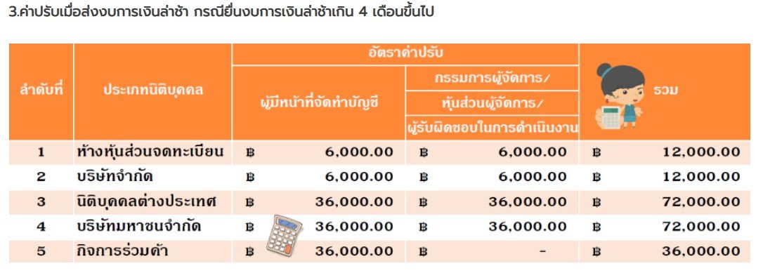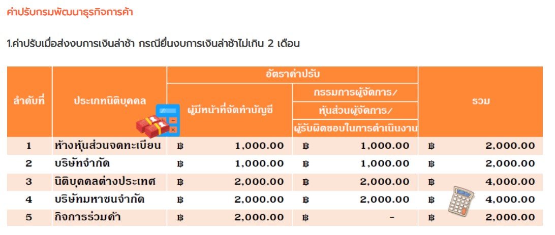 “ค่าปรับยื่นงบล่าช้าหรือไม่ได้ยื่นงบ” ผู้ประกอบการทั้งหลายคงไม่อยากจะได้ยินคำนี้เลย เพราะว่านอกจากจะต้องเสียเงิน เสียเวลา ยังนำมาซึ้งความไม่น่าไว้ว่างใจของลูกค้าที่จะเกิดขึ้นกับกิจการด้วย ทุกๆ ปีผู้มีหน้าที่จัดทำบัญชีจำเป็นจะต้องยื่นงบการเงิน(ภายใน 5 เดือน) และนำส่งภาษีประจำปีแก่สรรพากรในรูปแบบ ภงด.50(ภายใน 150 วัน) แต่ยังไงก็ตามถ้าพยายามแล้วยังไง ยังไงก็ไม่ทัน เราลองมาดูกันค่าว่ามีอะไรบ้างที่เราจะต้องเสีย จะได้เตรียมตัวเตรียมใจ และเตรียมเงินกันค่ะ ซึ้งค่าปรับที่ต้องเสีย มีอยู่สองส่วน คือ ส่วนของกรมพัฒนาธุรกิจที่ดูแลในด้านของงบการเงินประจำปี และส่วนของกรมสรรพากรที่ดูแลในเรื่องของภาษีประจำปี เรามาดูกันเลยค่ะว่าอัตราค่าปรับที่เราจะโดนนั้น เป็นอย่างไร แล้วมีอะไรบ้าง